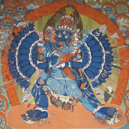 Монголоор Аюулган үйлдэгч хэмээнэ. Шашныг хамгаалагч арван хангал бурханы нэг бөгөөд оюун билэгийн бурхан Манзуширын догшин дүр нь ажээ. Шарын шашинд тахилга үйлдэхдээ эхэнд нь залж тахидаг ёс заншилтай. Хөмсөг сахалаас нь гал бадарсан, хурц соёотой, хэл нь мушгирсан, луугийн дуугаар дуугарсан, цусан дусал бүхий эрих хийж лагшиндаа өлгөсөн, хар могой болон хүний ясаар чих, бугуй, шилбээ чимэглэсэн, бадамлянхуа цэцэгт дэвсгэр дээр өөрийн юүм Доржсолонма хэмээх цэнхэр өнгөтэй баруун мутартаа гавал барьсан нүцгэн эмийг тэвэрч зогссон дүртэйгээр залардаг. Арван хангал бурхадын дотор хамгийн хүч чадалтай бурхан бөгөөд 9 тэргүүн, 34 мутар, 16 хөлтэй байдаг нь түүний хүч чадал газар бүрт зэрэг илэрч байдаг гэсэн утгатай, шашин номын дайснуудыг номхруулан дарах шидтэй.
