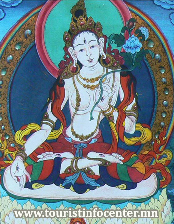 Насны гурван бурхан, хорин нэгэн дарь эхийн нэг, цаст уулын туяаг булаам тунгалаг цагаан дүрт Цагаан дарь эхийг бүтээлийн голд үлэмж томоор дүрслэн, дээд талд нь хөх тэнгэр ногоон, ягаан үүлс, нар, сар, доод хэсгээр нь хээр тал, усны шувууд бүхий байгалийн сайхны дунд цогцлоон дүрсэлсэн нь энэ бүтээлийн онцлог юм. Түүнчлэн Цагаан дарь эх үл мэдэг инээмсэглэн, мэлмий нь зөөлөн, энэрэлт харцаар ширтэнэ.