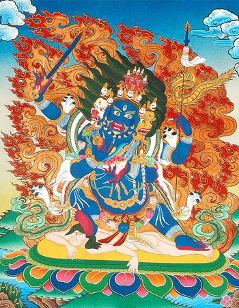 Монголоор Дөрвөн нүүрт хэмээнэ. Шашныг хамгаалагч Арван хангал бурхадын нэг бөгөөд Дэмчог бурханаас хувилан төрсөн номын сахиус ажээ. Догшин дөрвөн тэргүүнтэй, тэргүүн бүр улаан цагаанаар эргэлдсэн гурван мэлмийтэй, ам бүрээс нь дөрвөн соёо цухуйсан, хөмсөг сахал нь гал мэт бадарсан, тэргүүнийх нь үс дээш өрвийн боссон, тус бүрдээ таван хохимой толгойн чимэгтэй, бэлхүүсээрээ хорт могойг бүслэн хүлсэн, барын арьсан хормогч өмссөн, хохимой хэлхсэн эрихэн зүүлттэй, зах хязгааргүй хоосон агаар дунд хар бараан гурвалжин хүрээн дотор дайсан этгээдийн цусан далайн голд, бадамлянхуа цэцэг суурин дээр шашны тэрсүүтнүүдийг гишгэлэн босоо дүрээр заларсан байдаг.