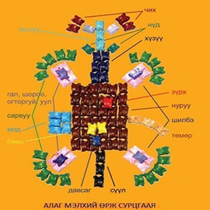 Мөн дөрвөн сарвуун дээр нь шороо, огторгуй, уул, салхи гэж тус тус нэг шагай