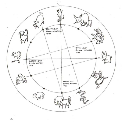 хужирлах зэрэг ажлаа амжуулж иржээ. Дөрвөлжин өрхийг хошуулдан татахад тоононы урд талд ил үлдсэн хэсгээр тусах гэрлийг наран цаг болгон хэрэглэдэг. Жишээ нь, тоононд туссан нарны гэрэл нь бар, туулай цаг буюу 4-6 цаг байдаг бол унины толгойноос ханын толгой хүрэх хугацааг луу могой цаг буюу 6-10 цаг, гэрийн хойморт тусах цагийг их үдийн 12 цаг буюу морин цаг гэх мэтээр нэрлэдэг байна. 60 уньтай бага дөрвөн ханат гэр наран цагтай яг цав тохирдог байна. Гэрийн тоононы хүрээнд гаргасан унины нүх бүр арван хоёр жилийн амьтнаар нэрлэгддэг. Хоймор талд элбэг баяны бэлгэ тэмдэг болох хулгана жил, баруун тотгоны үзүүрийн унь эр хүний хийморь цог залийг илтгэх морин жилд, зүүн тотгоны үзүүрийн унь эм хүний буян заяа сүү цагаан идээндээ байдаг гэдгийн бэлгэдэл болсон үхэр жилд тус тус таардаг байна.