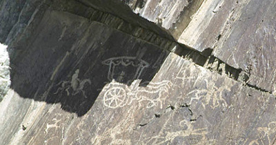 Ховд аймгийн Үенч сумын төвөөс 25 километрт орших Ямаан усны хавцлын хадан хананд байх бичгийн дурсгал юм. Энэхүү хавцал нь хоёр талаасаа эгц хадан ханаар хашигдсан бөгөөд дундуур нь горхи урсдаг. Янгир ямаа ирж тэр горхиноос ундаалдаг тул Ямаан ус гэж нэрлэгдэх болжээ. Хавцлын хананд янз бүрийн дурсгал үлдсэн байсныг эрдэмтэд илрүүлсэн. Янгир, буга, зээр, бөхөн, чоно зэрэг амьтад, найман хигээс бүхий дугуйтай морин тэргэнд суусан хүн, нум сум агссан анчид, нум сум харваж байгаа хүний араас сүх далайн цохих гэж буй дайн тулааны шинжтэй дүрслэл зургууд байдаг. Энэхүү зурагнаас Монгол нутагт язгууртнууд морин тэрэг хэрэглэж байсан гэдгийг ойлгох боломжтой. Мөн тэрэгний урд замчилж хөтөлсөн зэвсэгтэй хүн, ард нь морьтой дагасан хүний дүрслэл байгаа тул эрт үеийн язгууртнуудын эрх ямбыг илэрхийлсэн бололтой.