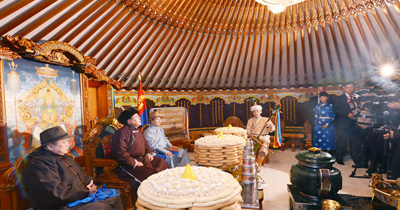 Төрийн хүндэтгэлийн өргөөний өмнө этгээдээс дөхөж очвоос үүд нь гурван давхар бөгөөд тэдгээр нь эртнээс уламжлалт ёсны дагуу ээлж дараалан нээгдэнэ. Хамгийн гадна талынх нь цагаан ширдэгэн үүд. Түүний түмэн насан хээн дэвсгэр дээр эвхмэл үсгээр “Түмэн амгалан” хэмээн ширсэн байгаа. Түүнийг нээхэд хүрэн зандан хаалга үзэгдэнэ. Төрийн соёмбот, эрдэнийн чулуун шигтгээт хоёр хавтас бүхий энэ хаалгыг эрдэнийн 1380 төрлийн чулуу, зааны соёо зэргээс бүтсэн зургаан тольт чүнчигноров чимэглэлт ган сийлбэрээр чимжээ. Хаалганы түлхүүрийн улаан зандан модон дээр “Төрийн ёслол хүндэтгэлийн өргөө” гэж уйгаржин монгол бичгээр цалин цагаан мөнгөөр урласан байна. Гурав дахь нь Төр түвшин, Түмэн амгалан хэмээн хүндэтгэл үзүүлсэн торгон хатгамалан үүд. Түүний гадна тал тэнгэрийн өнгөтэй. Дотор талд нь “Мөнх тэнгэрийн хүчин дор Их Монгол улсын далай Хааны зарлиг их булхай эргэн дор хүрвээс аюутугай, биширтүгэй” хэмээсэн Чингисийн зарлигийг зээгт наамлын аргаар бүтээжээ. Ийнхүү гурван үүдийг дэс дараалан, ёс төртэй нээж, өргөөнд морилохуй багана үгүй, мөнх тэнгэрт тогтсон их найман ханат гэрийн доторх байдал нүдний өмнө харагдана.